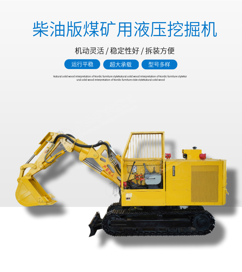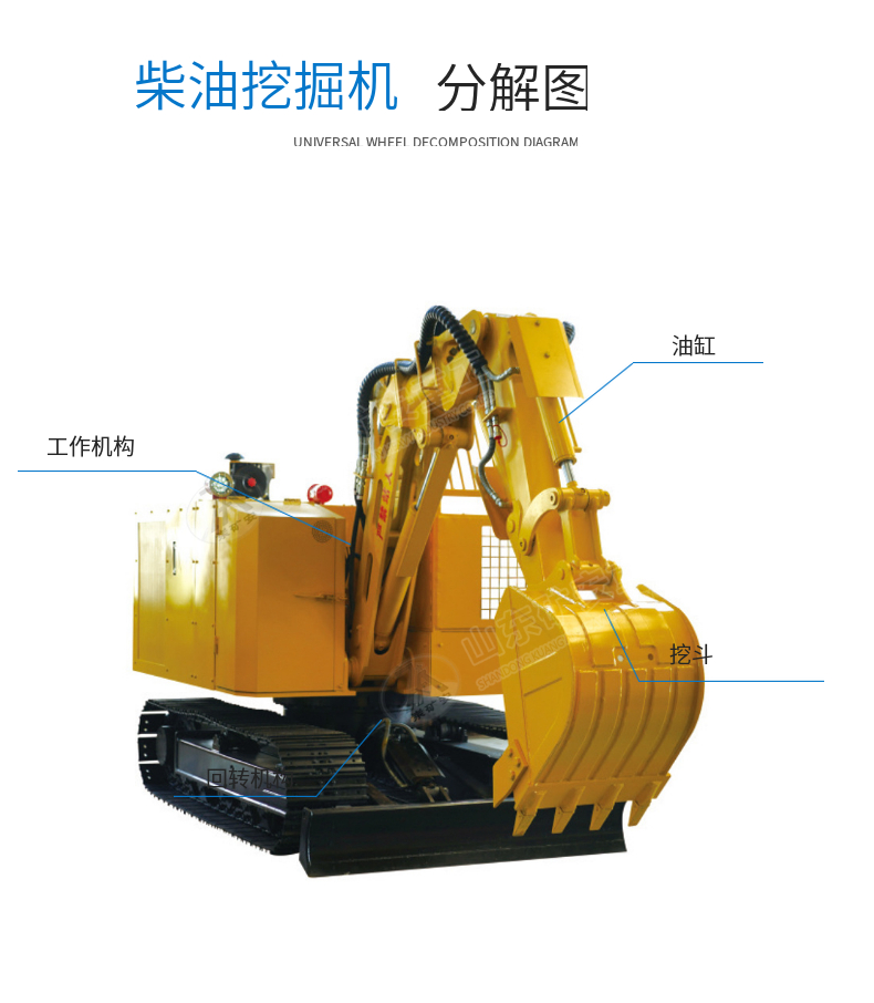 柴油版挖掘机采用模块化设计,结构紧凑,外型简洁,操作方便,机动灵活,稳定性好,拆装方便,便于垂直下井使用。